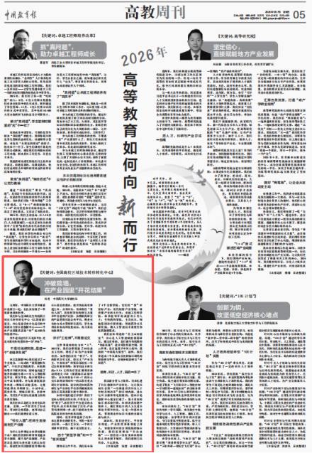 1月7日,《中国教育报》第5版刊发“2026年高等教育如何向新而行”专题,以整版篇幅系统呈现了2025年中国高等教育的改革图景。专题从人才培养模式的重塑、科技成果转化的突破、新兴领域的靶向支撑,到服务区域发展的生态构建等多个维度,深入探讨了中国高等教育深度融入中国式现代化建设的新范式。其中,我校依托全国高校生物医药区域技术转移转化中心(江苏南京)开展的创新改革实践,作为“高校服务区域发展,实现科技成果转化系统性破局”的典型案例获得重点报道。该报道深入采访我校党委常委、副校长杨勇,以《冲破院墙,在