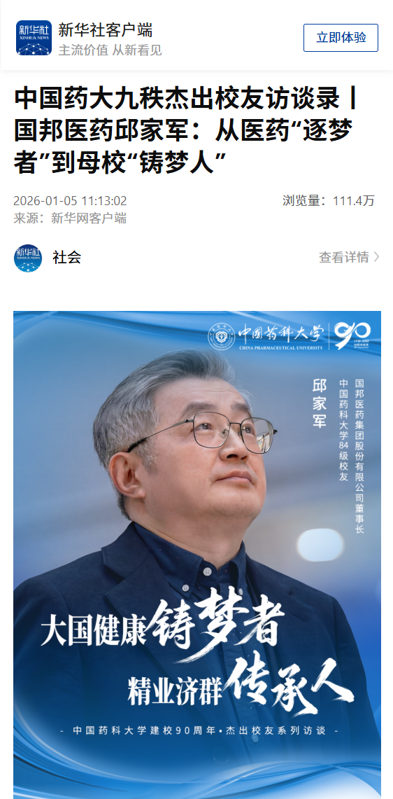 近日,新华社、新华网等中央主流媒体刊发国邦医药集团董事长、我校1984级校友邱家军先生的深度报道。截至目前,全网累计阅读量超过580万人次。此次报道以新华社客户端、新华网网站及客户端为核心平台,并联动行业媒体,通过海报、视频、图文等多种形式形成了广泛传播态势。据了解,作为中国药科大学建校90周年·杰出校友系列访谈的一个单元,该系列报道不仅回顾了邱家军先生的创业历程与“人生三处方”理念,更以《从医药“逐梦者”到母校“铸梦人”》为题生动讲述了其个人成就与母校育人传统紧密相连的故事。邱家军先生在事业有