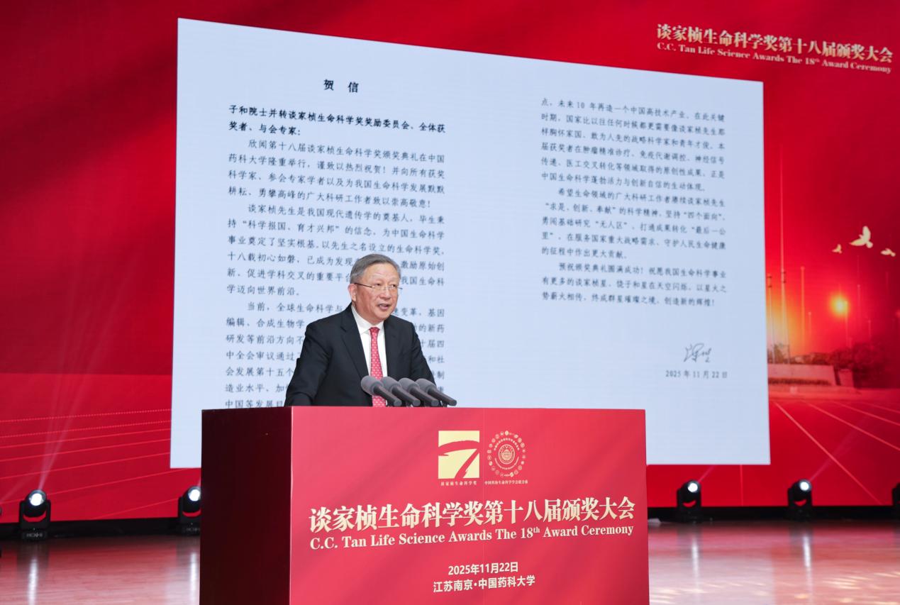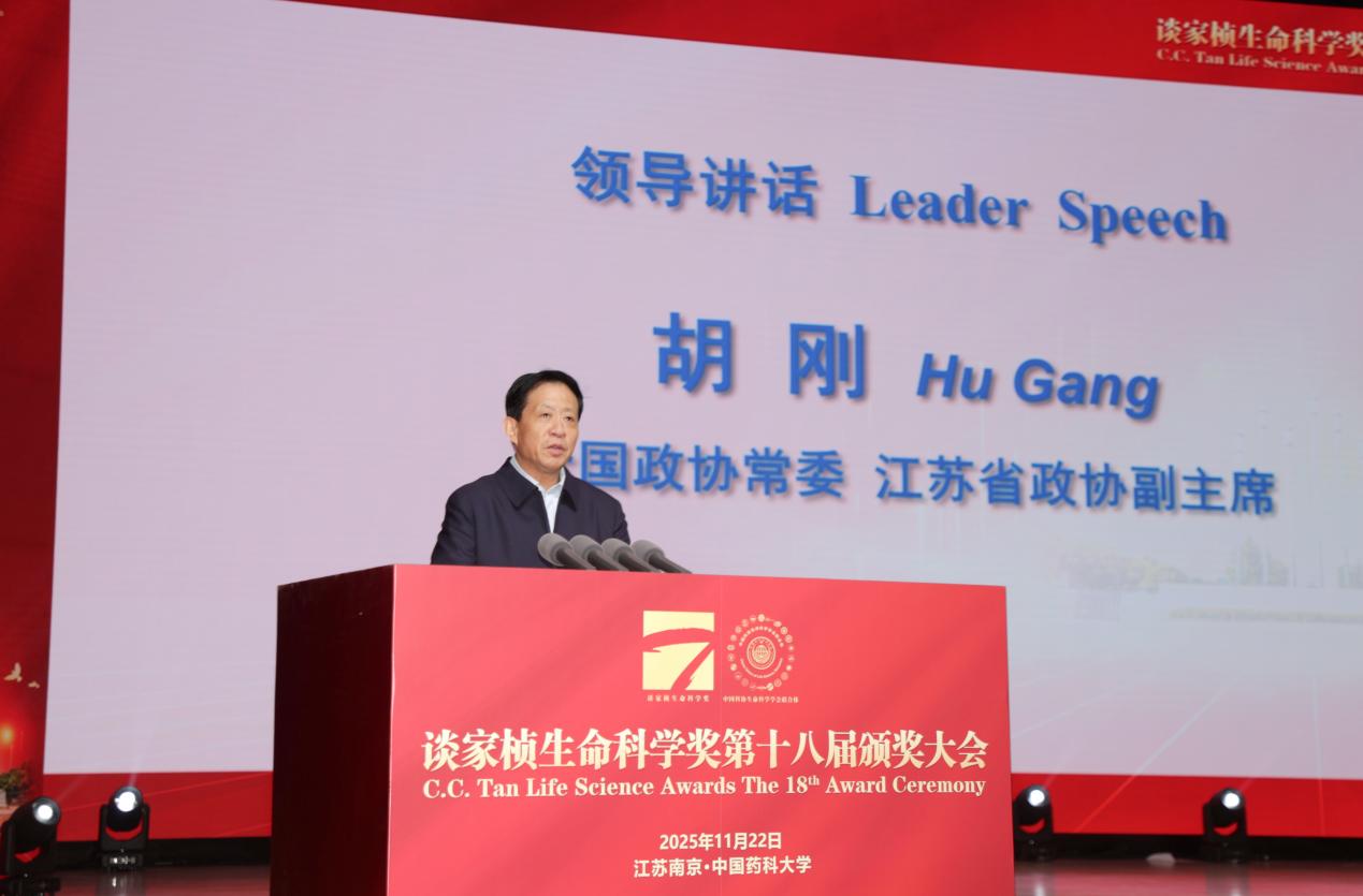 胡刚代表江苏省委、省政府发表讲话。他表示,此次会议既是生命科学领域的一次盛会,更是江苏推动科教产才深度融合的重要契机。江苏作为教育大省、科技大省、人才大省,一直以来省委、省政府高度重视生命科学研究和生物医药产业发展,始终将其置于高质量发展的重要位置。中国药科大学作为我国药学领域的黄埔军校,始终与国家同频、与时代共振,在人才培养、科学研究、服务社会等方面作出了突出贡献。相信在谈家桢先生精神的指引下,在各位专家的鼎力支持下,在政产学研的协同努力下,中国生命科学领域必将涌现更多原创性突破,江苏生物医药产业必将为健康中国建设作出新的更大贡献。