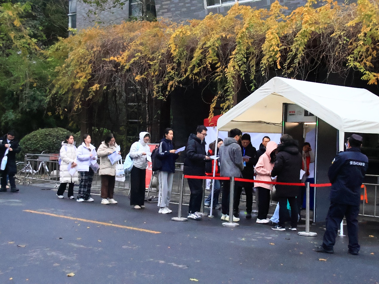 学校严守安全底线,开展命题人员业务与保密培训,建立严格的命题审核机制,加强对命题全过程的监督管理,确保试题安全万无一失。考点安排专人进行24小时保密值班,守牢试卷安全保密底线,确保试卷流转绝对安全。配备智能安检门,优化入场路线并组织多轮演练。配备10余个电子产品存储柜,加装防雨设施并全程监控。考场启用信号屏蔽仪,严格执行“两次安检”,切实维护考试公平公正。同时,坚持以生为本,通过多渠道提前发布考场指引、天气提醒等,安排志愿者引导协助,做好餐饮、医疗等保障,快速护送有困难考生入场,营造温馨有序的考试环境。