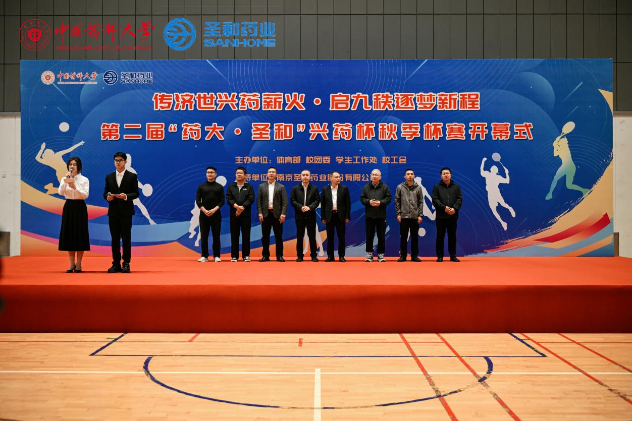 近日,第二届“药大·圣和”兴药杯秋季杯赛开幕式在江宁校区体育馆开幕。南京圣和药业董事长王勇,校党委常委、副校长丁锦希,以及相关职能部门负责人和师生代表等3000余人参加活动。丁锦希致开幕辞。他代表学校向始终心系母校、情牵教育事业的王勇董事长致以诚挚谢意,向辛勤筹备赛事的工作人员表示亲切问候,向全体参赛师生致以美好祝愿。丁锦希鼓励师生在运动中感受快乐、在协作中凝聚情谊、在挑战中实现突破,为培养全面发展的药学人才注入源源不断的活力。王勇在致辞中表达了重返母校的激动心情,勉励在校学子既要在运动场上强健