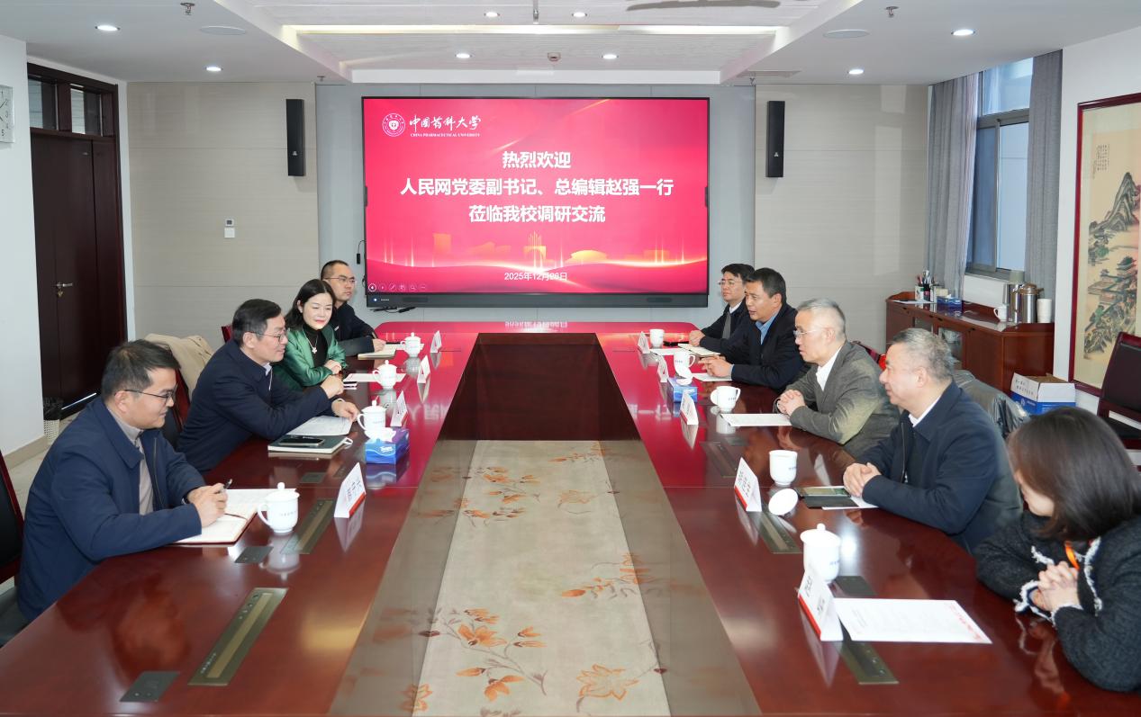 12月26日下午,人民网党委副书记、总编辑赵强一行来校调研交流。省委宣传部副部长胡连生,人民网战略委员、江苏分公司总经理汪峥嵘等陪同调研。校党委书记戴建君出席座谈会,人民网江苏分公司以及我校党委办公室、党委宣传部相关负责人参加会议。校党委常委、宣传部部长刘燕莉主持会议。座谈会上,戴建君代表学校对赵强一行的到访表示热烈欢迎。他首先介绍了中国药科大学的历史沿革、学科特色、师资力量以及近年来在服务国家和区域经济发展方面所作的贡献,并重点阐述了学校将人工智能赋能创新药物研发的这一重要战略方向。他指出,今