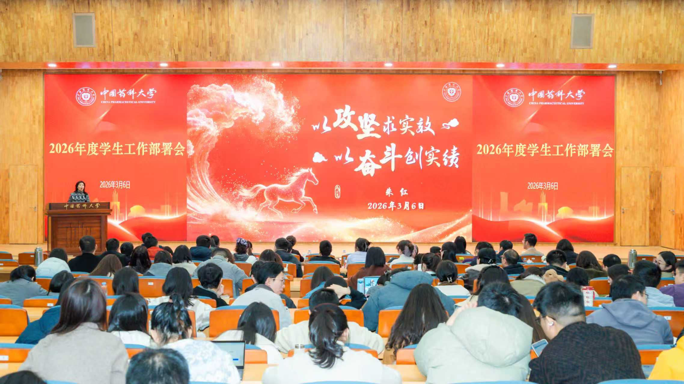3月6日上午,我校在江宁校区会议中心二楼报告厅召开2026年度学生工作部署会。校党委副书记朱红,校党委副书记、纪委书记陈文恩出席会议。学生工作部、招生就业处、校团委全体人员,各学院分管学生工作副书记、全体专兼职辅导员参加会议。会上,学生工作部、招生就业处、校团委负责人分别就本部门2026年重点工作进行部署。学生工作部副部长卢献锁对《中国药科大学关于全面加强和深入推进新时代辅导员队伍建设行动方案》(药大党〔2026〕5号)等文件进行解读。朱红以《以攻坚求实效,以奋斗创实绩》为题,从恪守学生工作的“