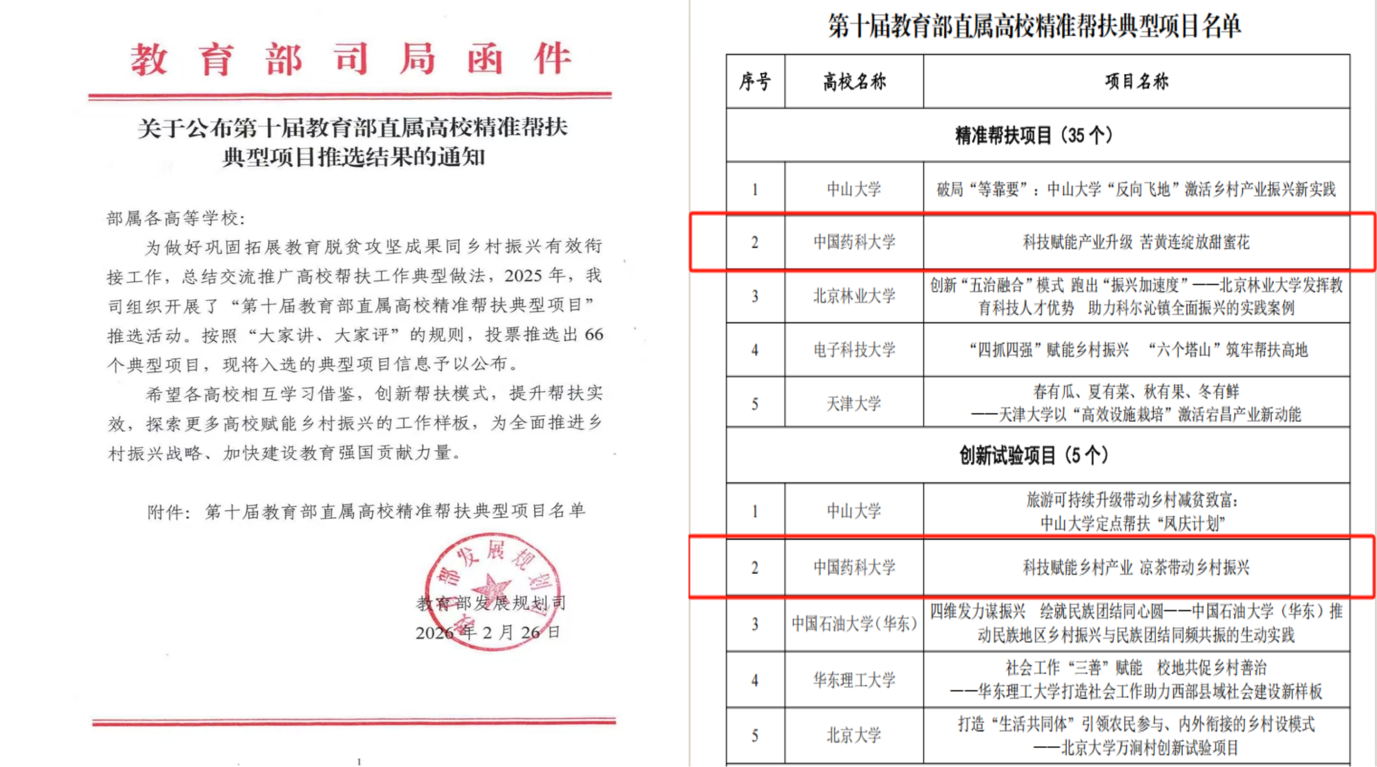 近日,第十届教育部直属高校精准帮扶典型项目推选结果正式公布,我校申报的《科技赋能产业升级苦黄连绽放甜蜜花》在精准帮扶典型项目中位列第二;我校中药学院申报的《科技赋能乡村产业凉茶带动乡村振兴》在创新试验项目中位列第二。我校已连续10次,累计12个项目成功入选教育部直属高校精准帮扶典型项目,是教育部直属高校中入选次数最多、入选项目最多的高校。我校精准帮扶典型项目聚焦镇坪中药首位产业龙头——黄连产业建设,2025年帮助引入陕南首家牙膏厂投资2000万元落户镇坪,预计年产值2亿元、利税200万元,带动5