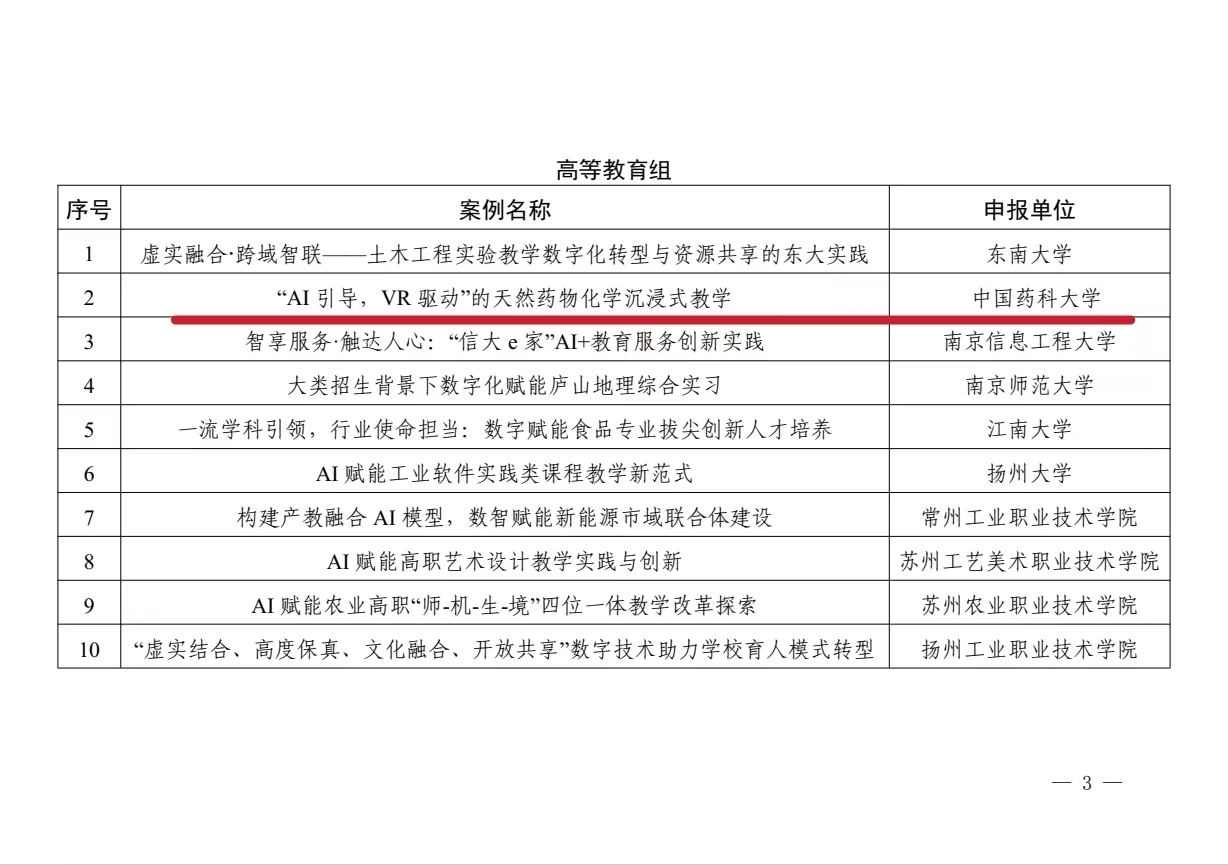 近日,江苏省教育网络安全和信息化领导小组办公室正式公布2024年度全省教育数字化创新案例遴选结果,我校申报的《“AI引导,VR驱动”的天然药物化学沉浸式教学》案例成功入选。